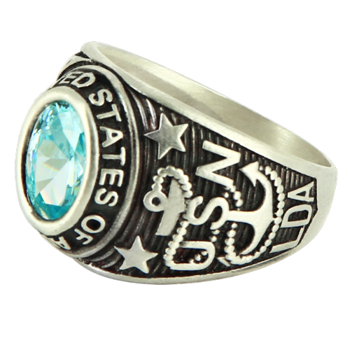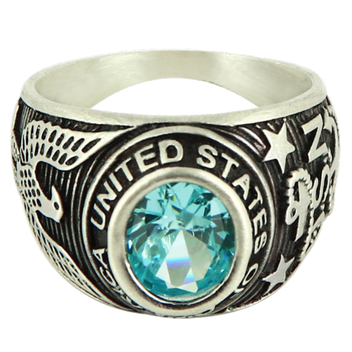 Cette chevalière pour homme, en argent massif 925/1000, possède un magnifique design universitaire. Un oxyde de zirconium couleur aigue marine rehausse cette bague pour un look old-school tendance.
